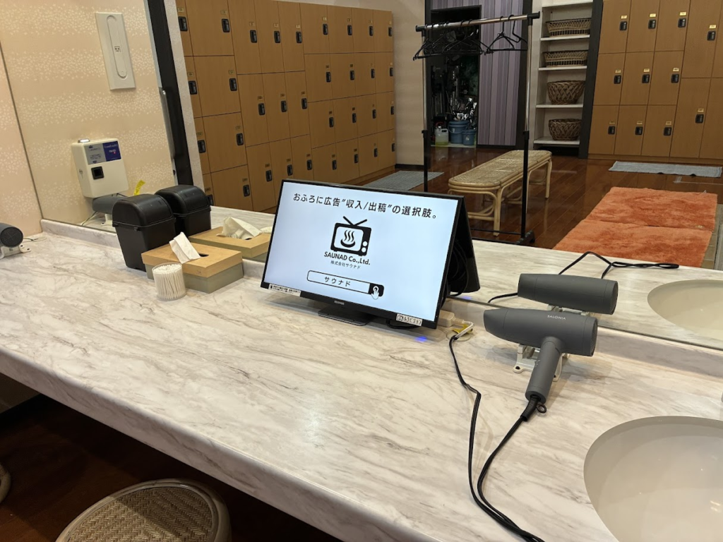 鳩の湯に設置しているデジタルサイネージ広告「ふろビジョン」の設置の様子をご紹介します。